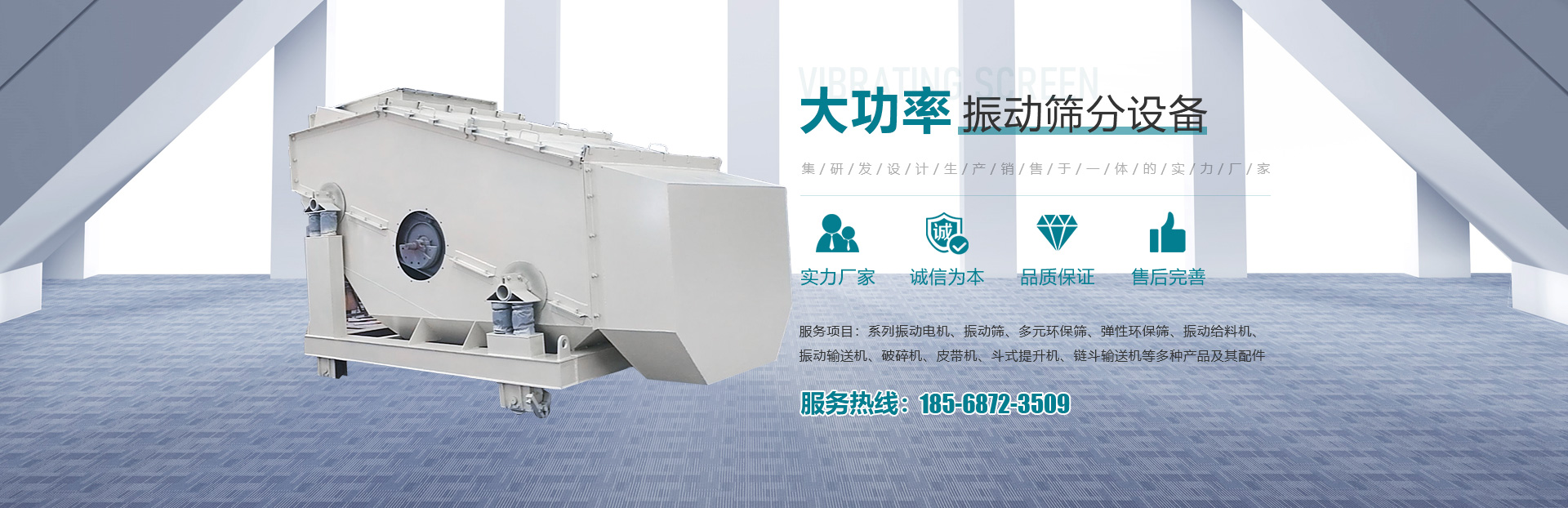 • 主要產(chǎn)品有系列振動電機、振動篩、多元環(huán)保篩、彈性環(huán)保篩、振動給料機、振動輸送機、破碎機、皮帶機、斗式提升機、鏈斗輸送機等多種產(chǎn)品